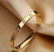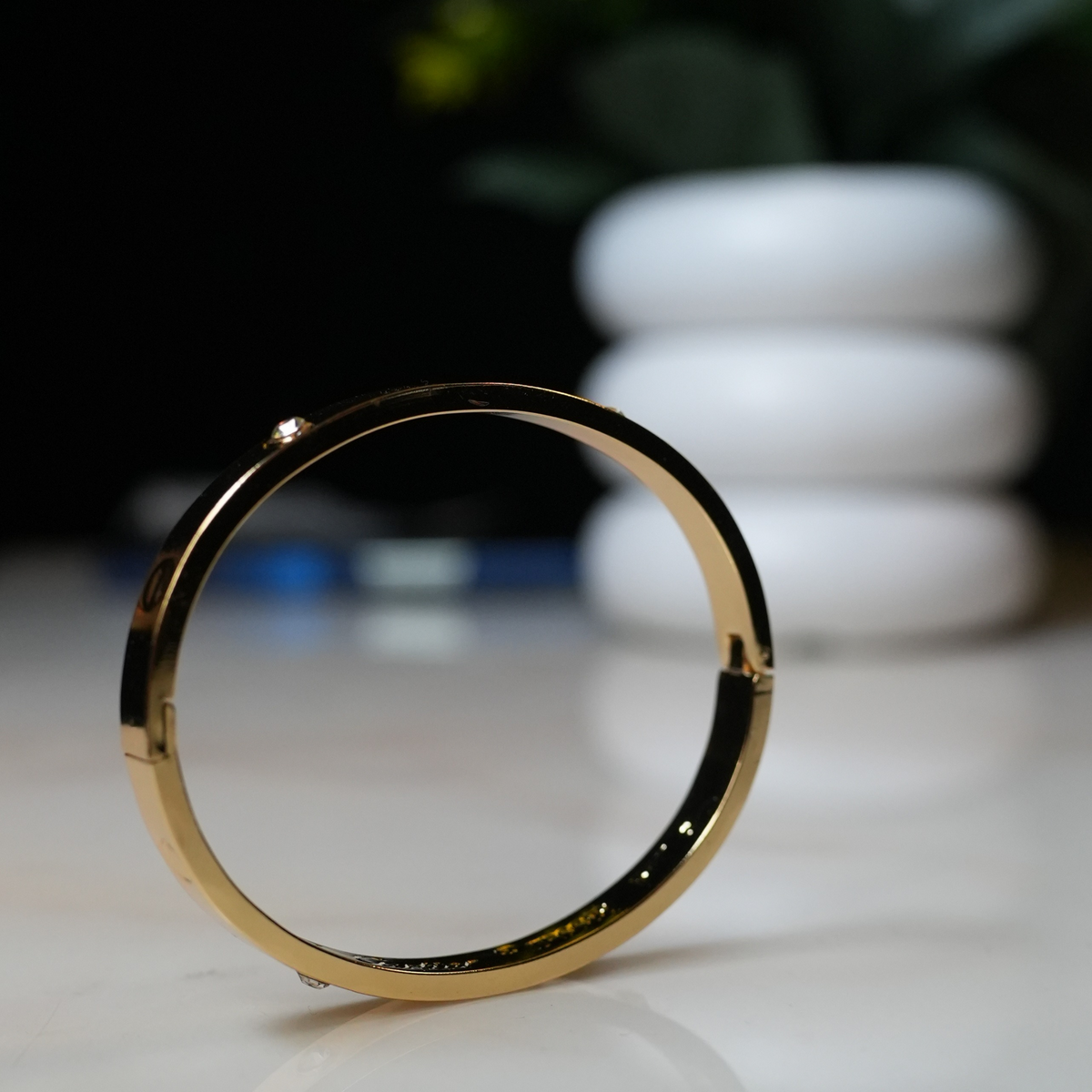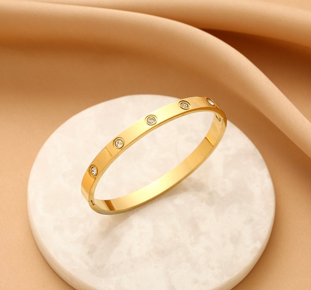 The Eterna Gold Luxe Bangle by DlushJewels is a symbol of refined minimalism. Crafted in a rich gold finish and studded with high-shine crystals, this bangle is designed to blend luxury with everyday wear. Engraved accents add a touch of uniqueness, making it perfect for solo styling or stackable flair.